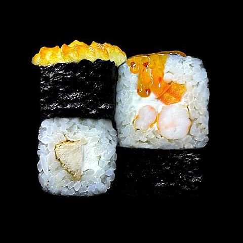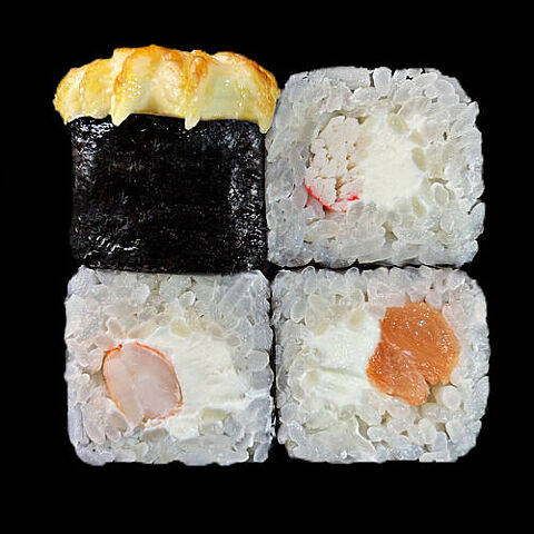 Запеченный с курицей, с крабом, с лососем и с огурцом(с золотистой шапочкой и свежайшим рисом)-мини-сет, но максимум гастрономического удовольствия!