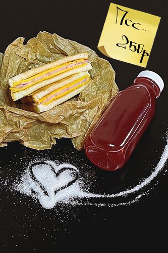 Погрузитесь в мир вкусов с освежающим комбо: морс, насыщенный ягодной свежестью, идеально сочетается с аппетитным сэндвичем, в котором ветчина и сыр создают гармонию нежности и насыщенности. Этот дуэт станет вашим верным спутником в любое время дня, даря заряд энергии и радость простых удовольствий. Позвольте себе насладиться моментом, когда каждый укус и глоток наполняют вас теплом и уютом.