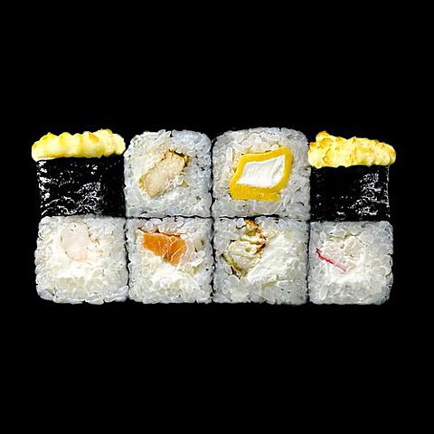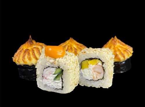 Запеченный с лососем, креветкой и крабом-все эти роллы можно заказать в одном сете, что очень удобно для любителей морепродуктов.